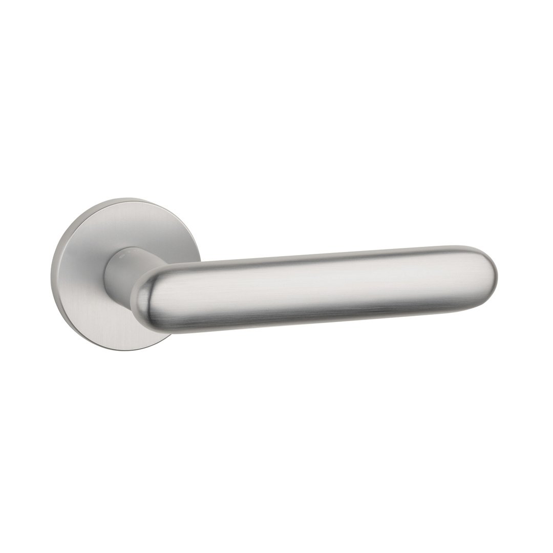 Beschrijving Stille deurklinken LARKA ROSETTE mat chroom op ronde rozetten Ø 53 mm