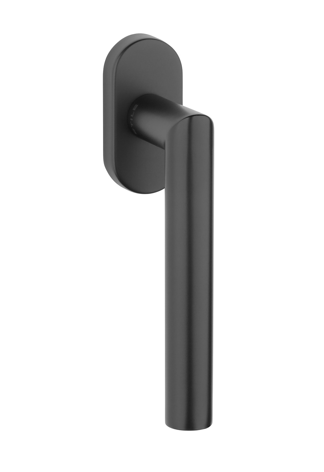 Beschrijving STILE raamkruk YUZA op een ovaal rozet met een greep van 22,5 x 9 mm uit gevoerd in het mat zwart