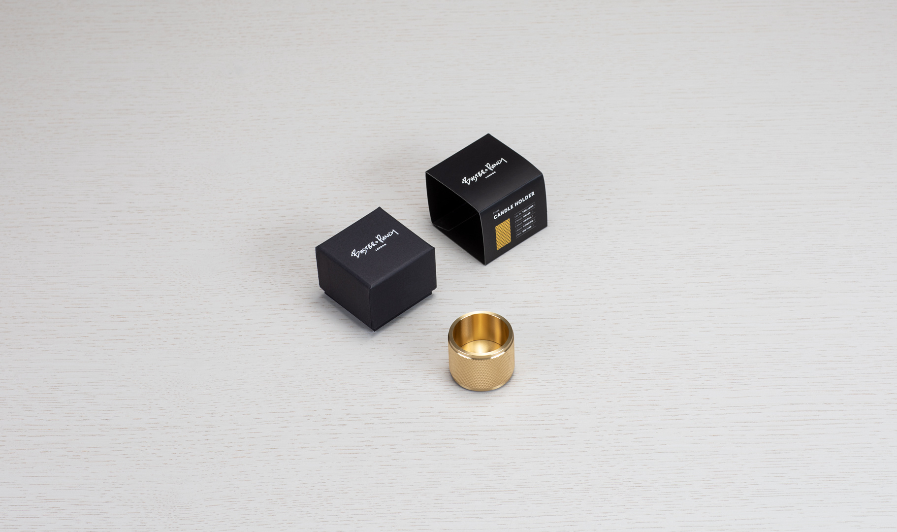 Beschrijving Luxe gouden B+P theelichthouder, met het kenmerkende diamant geslepen patroon van Buster+Punch