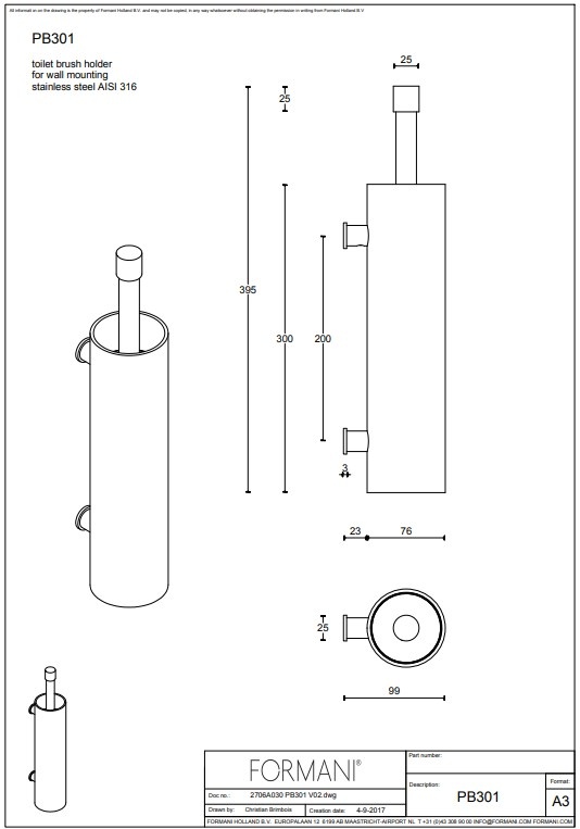 Beschrijving Toilet borstel ontworpen door Piet Boon ONE PB301 voor Formani voor muurbestiging afgewerkt in geborsteld RVS