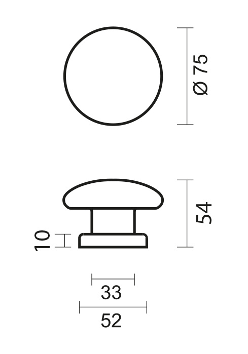 De deurknop heeft Ø van 75mm en staat op een rozet met een Ø van 52mm dat 10mm naar voor komt. De vaste deurknop komt in totaal 54mm naar voor. Deze knoppen kunnen gebruikt op deuren tot 60mm dik.