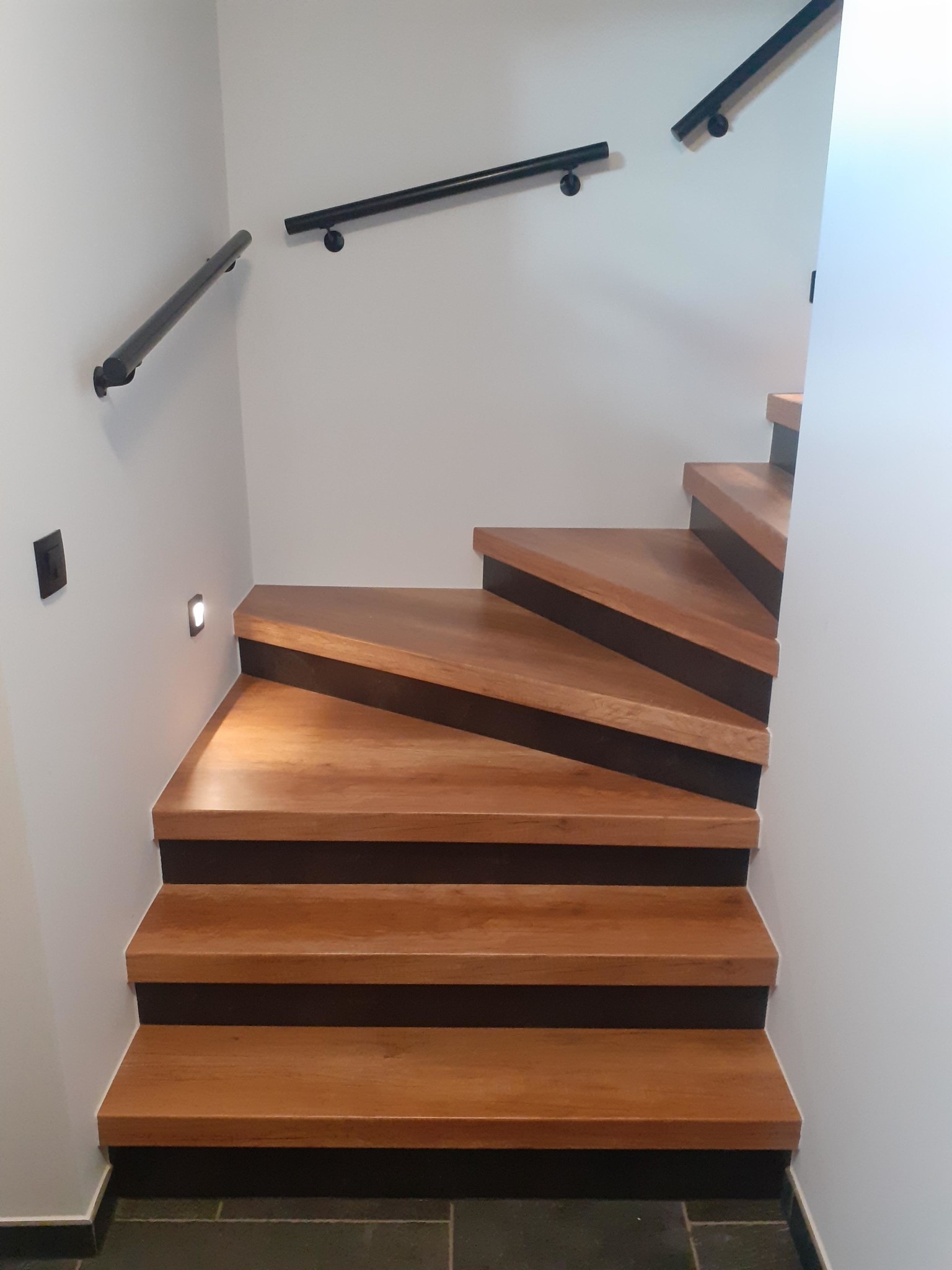 De mat zwarte trapleuningen hebben een voet van 52mm en dienen geschroefd te worden tegen de muur.