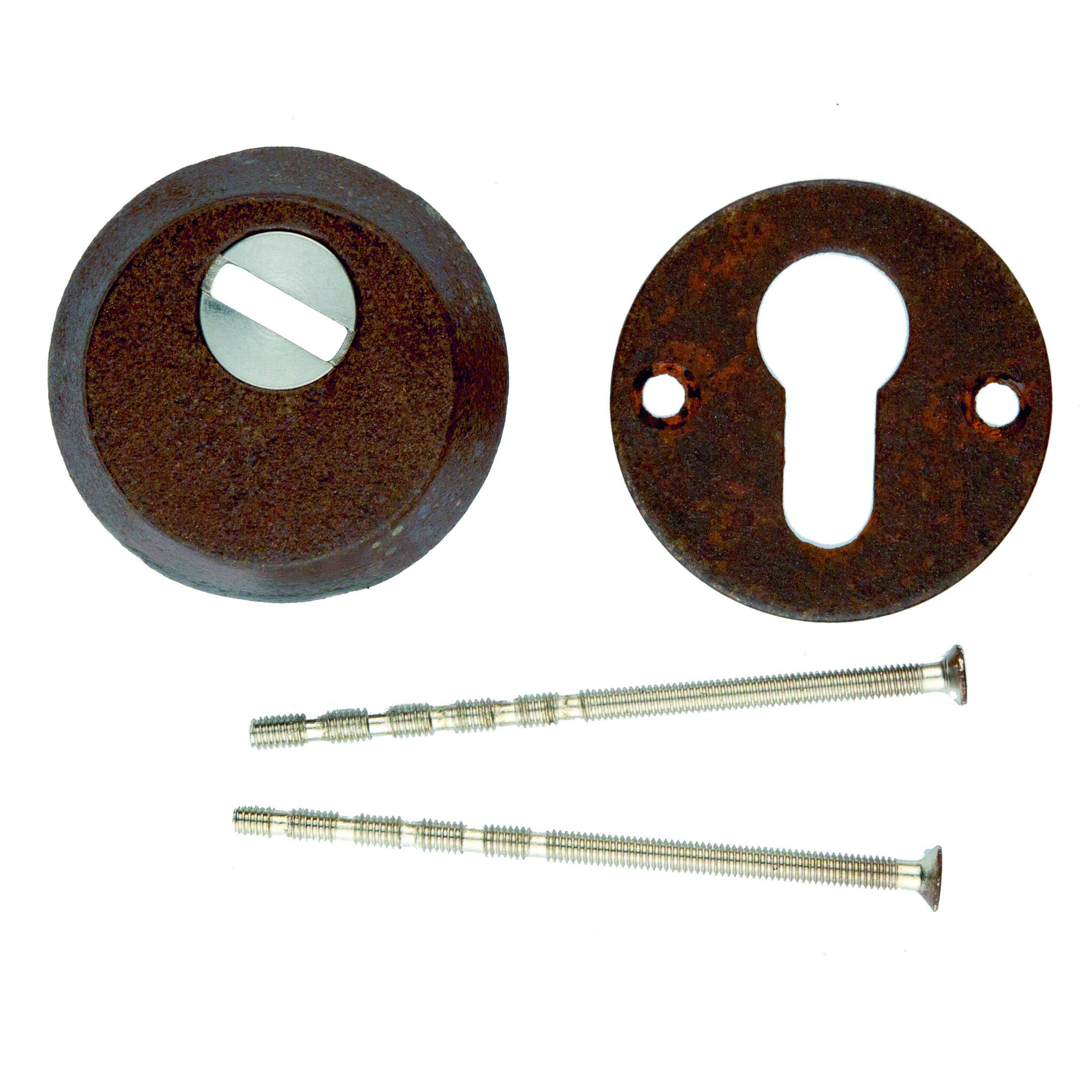 Beschrijving Metalen veiligheidscilinderplaatjes van 10 mm dik met een roest bruine afwerking ook voor buiten met boorbeveiliging