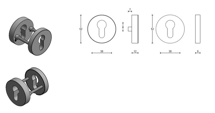 De diameter van deze rozetten bedraagt 52 mm. De dikte aan de buitenzijde is 12 mm en de dikte aan de binnenzijde bedraagt 9 mm.
