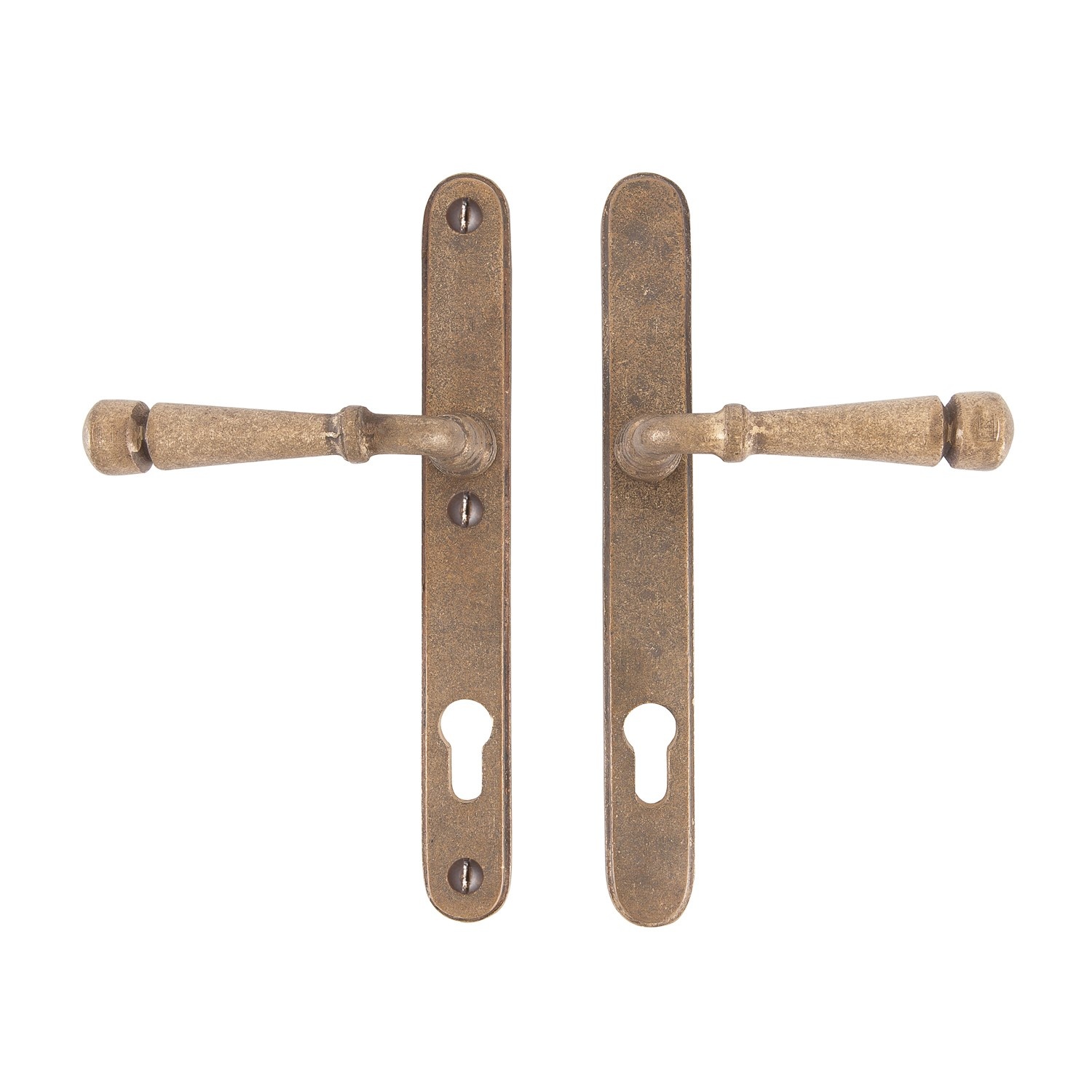 Beschrijving Smal ruw bronzen veiligheidsgarnituur dat voorzien is van 2x een deurklink PH1830, verkrijgbaar met een PZ asmaat van 72, 92 of 110mm