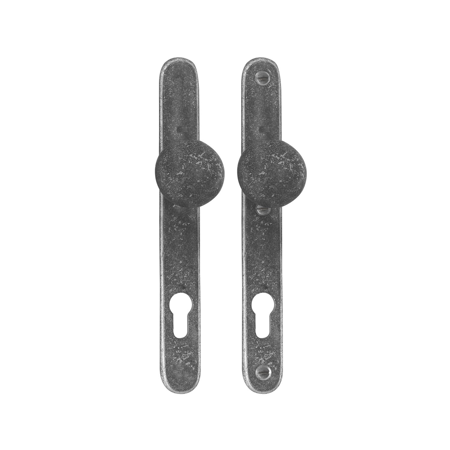 Beschrijving Smalschild veiligheidsgarnituur in ruw metaal dat voorzien is van 2x een ronde deurklink Pure® PHR met een PZ asmaat van 72, 92 of 110mm