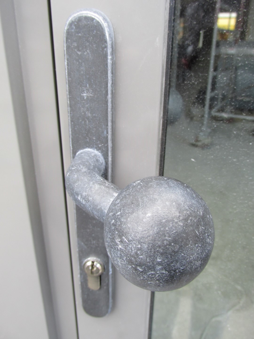 Het veiligheidsgarnituur in ruw metaal is aan de buitenzijde voorzien van een vaste knop en aan de binnenzijde van een Pure® PH1928 deurklink. Bij deze uitvoering wijst de klink naar rechts. Wil je de linker uitvoering kijk dan bij de gerelateerde producten.