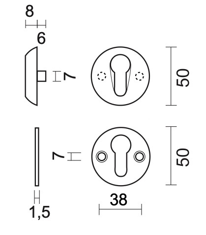 De goudkleurige veiligheidscilinderplaatjes zijn rond 50 mm. Het buitenrozet (A) is 8mm dik en het rozet aan de binnenzijde heeft een dikte van 1,5 mm.