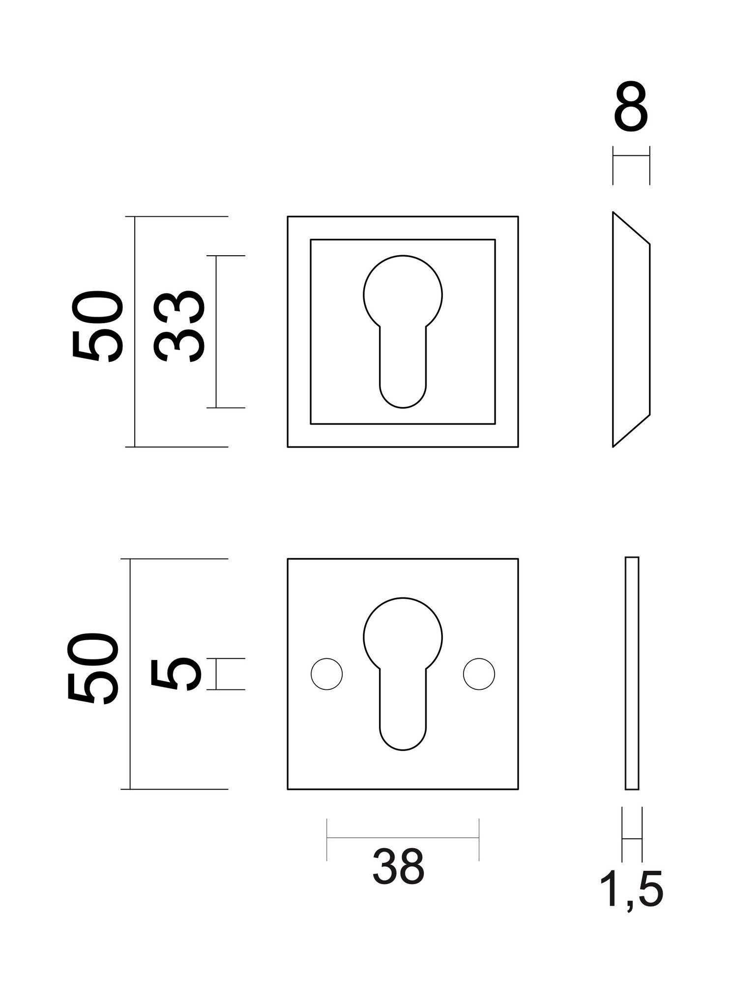 Deze Old Silver veiligheidscilinderplaatjes zijn vierkant 50x50 mm. Het buitenrozet (A) is 8mm dik en het rozet aan de binnenzijde heeft een dikte van 1,5 mm.