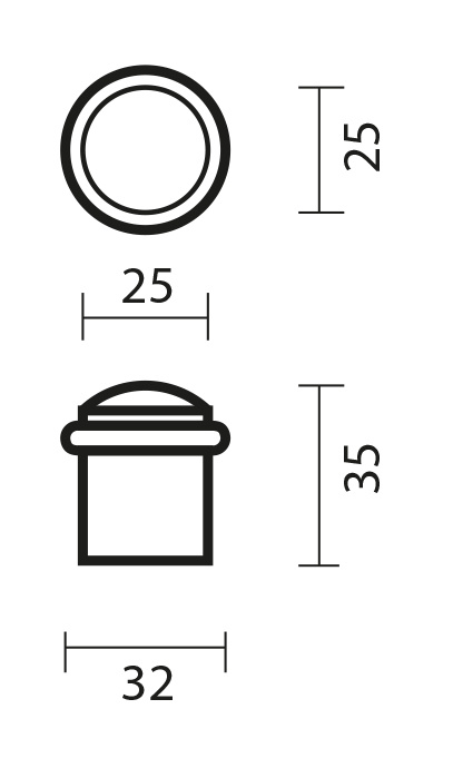 De RVS deurstoppers hebben een diameter van 25mm, een hoogte van 35mm en zijn voorzien van een rubberen stootrand die een Ø heeft van 32mm.