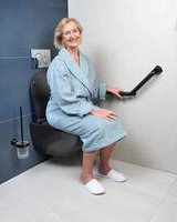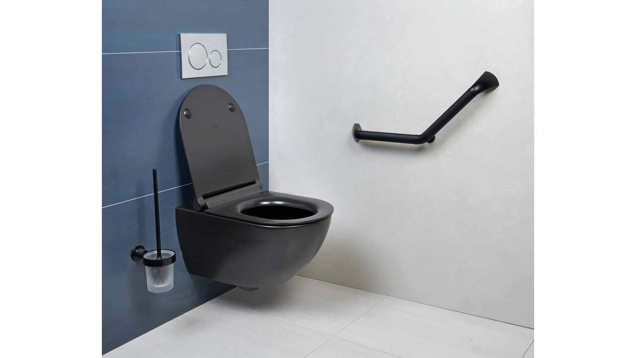 Uitgevoerd in geanodiseerd aluminium met een slijtvaste, zwarte coating biedt deze wandbeugel stevige ondersteuning in twee richtingen. Dankzij de hoek van 45° is hij ideaal voor gebruik naast het toilet, in de douche of bij het bad, waar extra grip en houvast gewenst zijn.