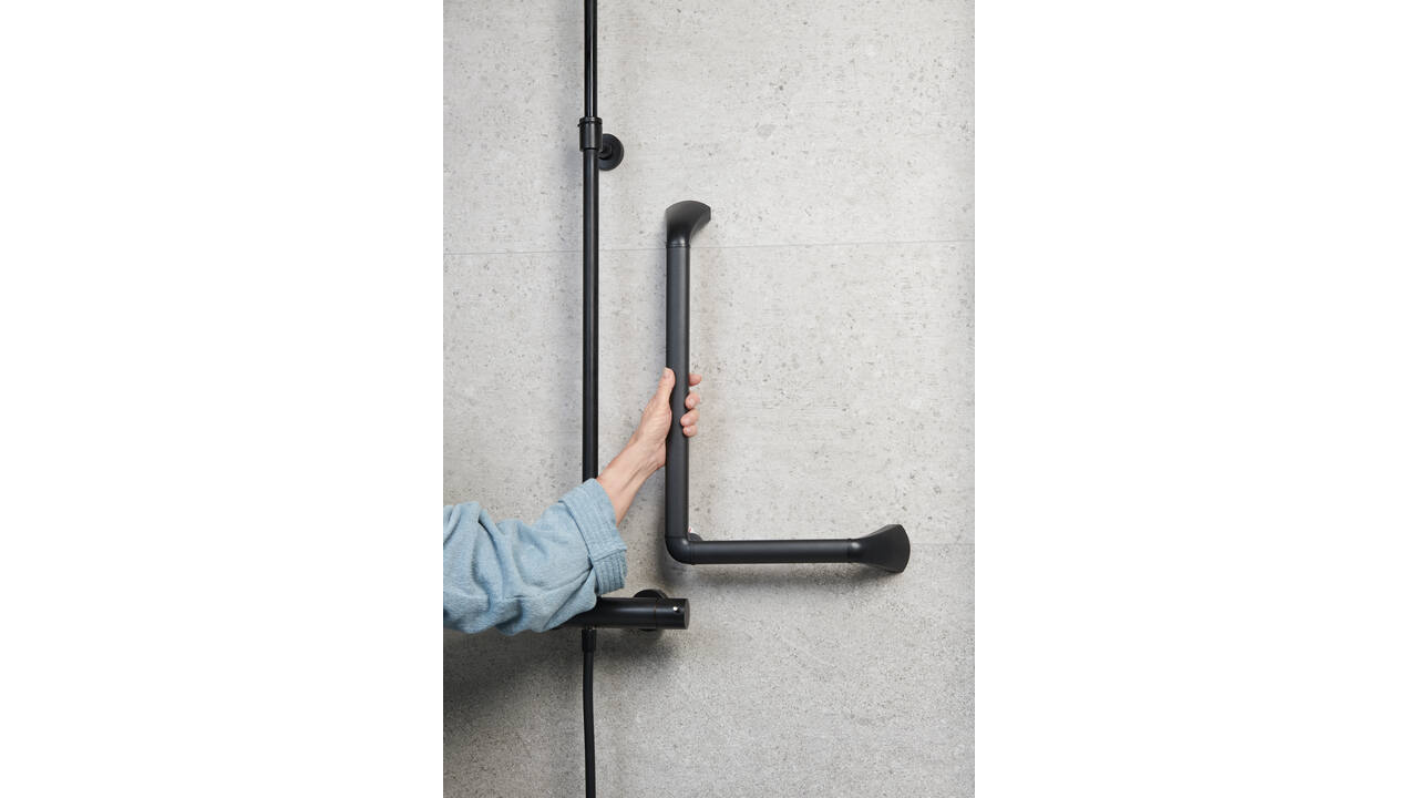 Uitgevoerd in geanodiseerd aluminium met een slijtvaste, zwarte coating biedt deze wandbeugel stevige ondersteuning in twee richtingen. Dankzij de hoek van 90° is hij ideaal voor gebruik naast het toilet, in de douche of bij het bad, waar extra grip en houvast gewenst zijn.