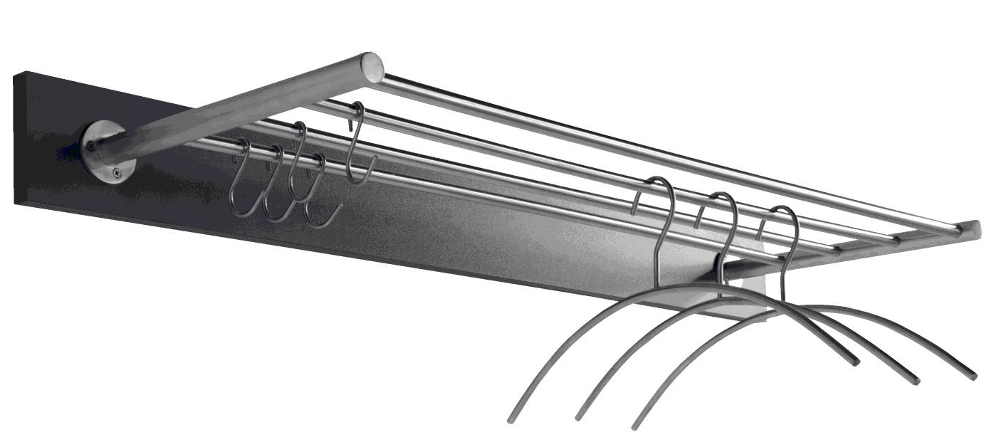 Beschrijving Wandrek garderobe uitgevoerd in RVS van 870 mm breed inclusief 3 kleerhangers