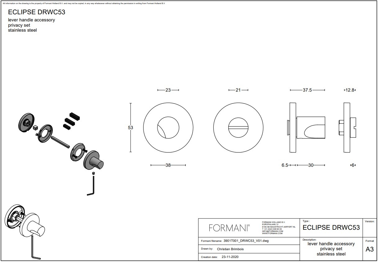 Het toiletgarnituur uit RVS wordt op het einde voorzien van een sterke mat zwarte PVD coating. De plaatjes hebben een diameter van 53 mm en zijn slechts 6,5 mm dik.