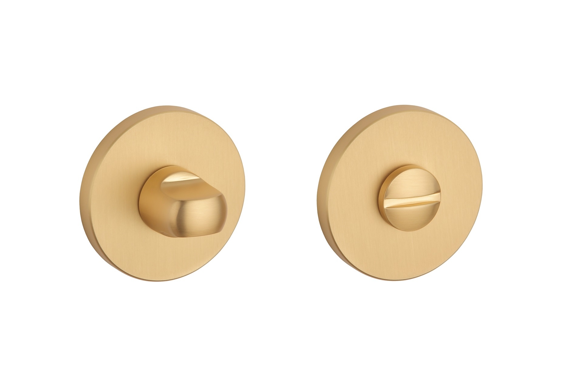 Dit mat gouden WC garnituur heeft ronde rozetten van Ø 53mm met een dikte van slechts 7mm zodat ze er esthetisch zeer mooi uitzien op de deuren.
