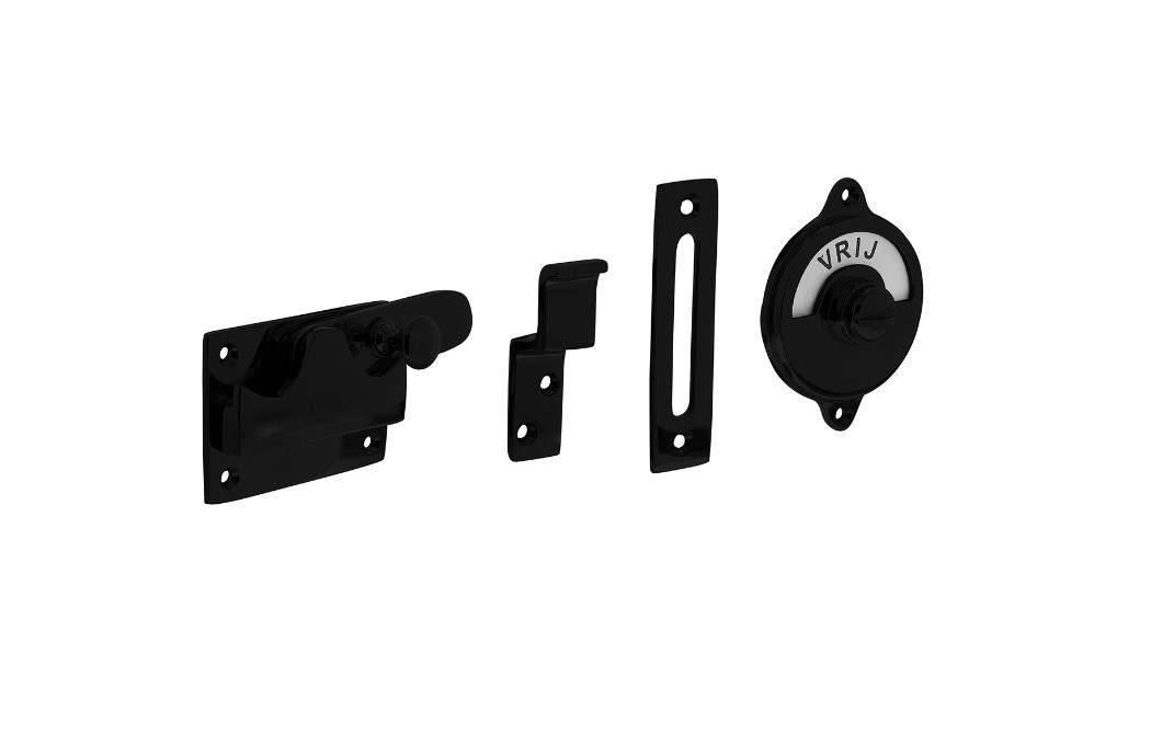 Beschrijving Klassiek wc garnituur met rechte arm en tekst "vrij/bezet" in mat zwarte uitvoering