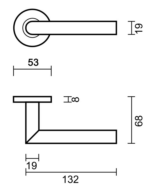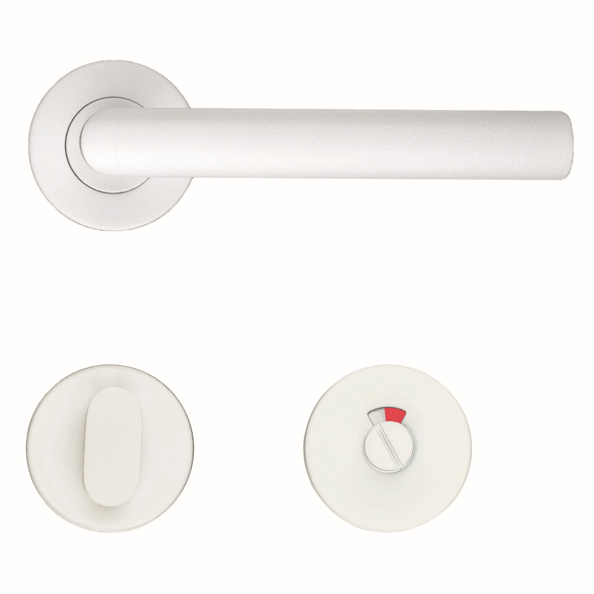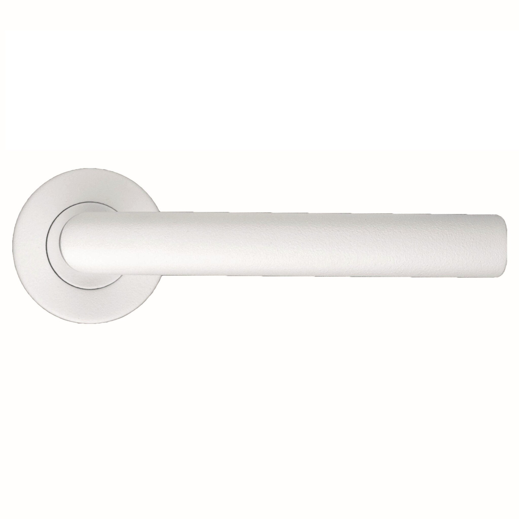 Beschrijving Witte deurklinken I Shape 19mm met structuur onder een hoek van 90° op een rond rozet verkrijgbaar in 4 varianten