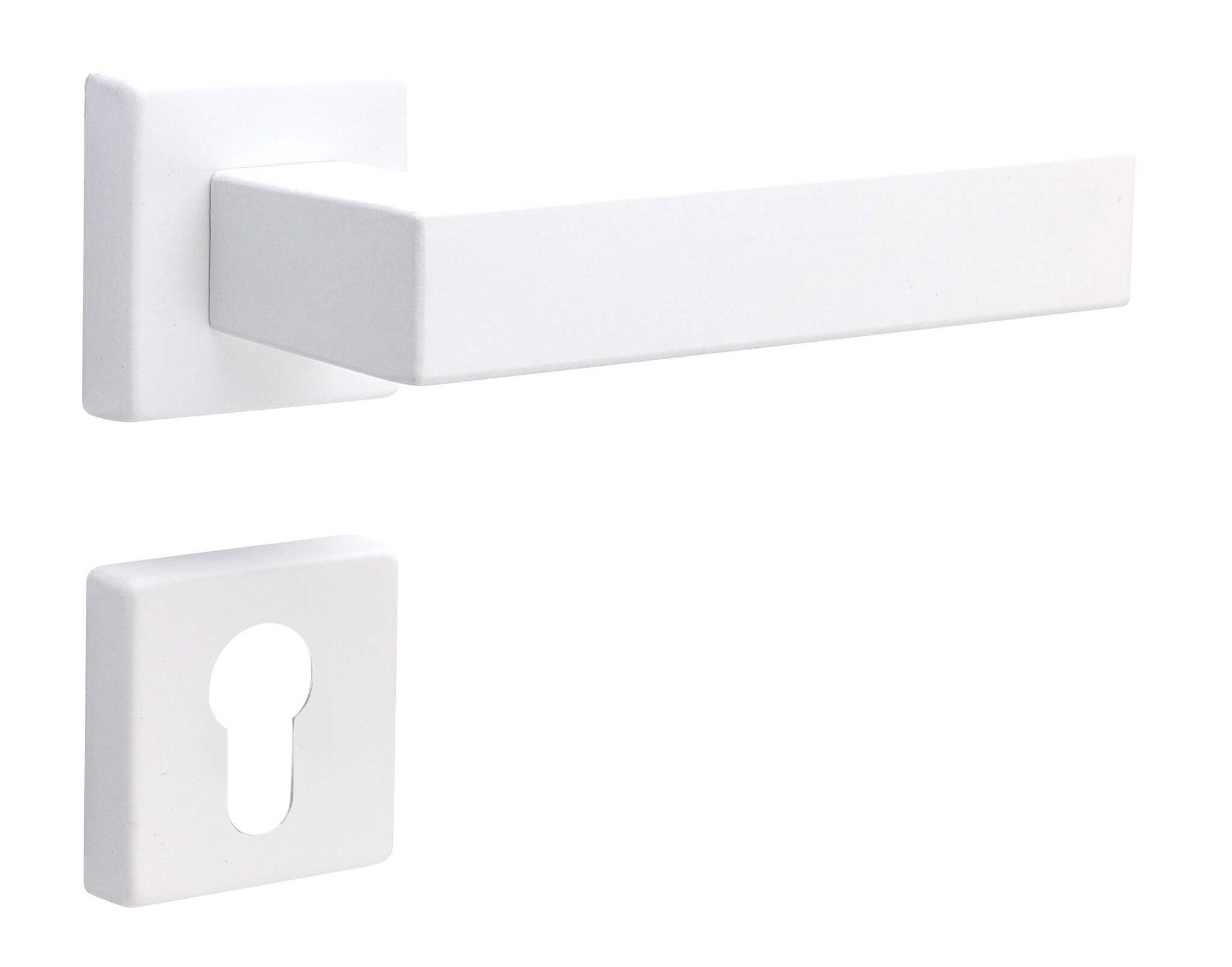 Beschrijving Witte deurklinken Kubo op een vierkant rozet verkrijgbaar in 3 varianten