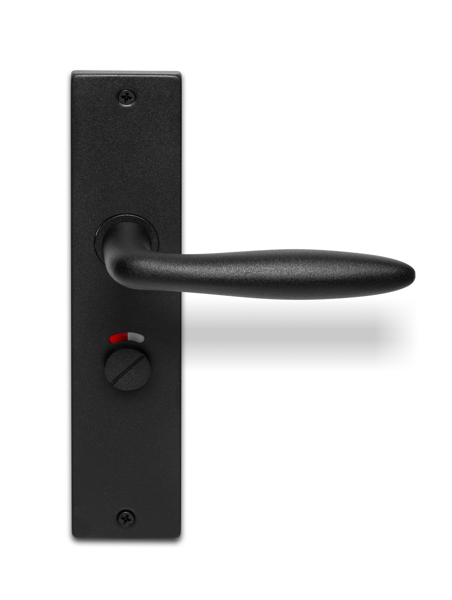 Dit zwart model is leverbaar in een blinde versie, sleutelversie (asmaat56mm), cilinderversie (55mm) en een schild met wc garnituur (63/8mm).