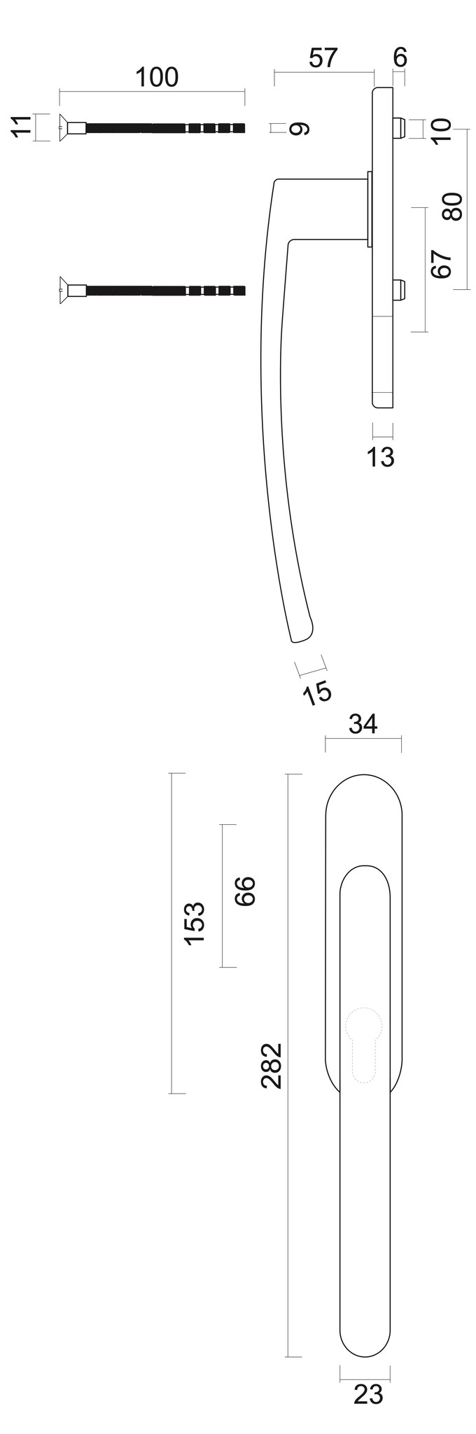 Deze set heeft licht gebogen grepen van 23 mm breed met als basis messing, afgewerkt met een zwarte coating. Het ovale schild is 34x153 mm en komt 13 mm naar voor.