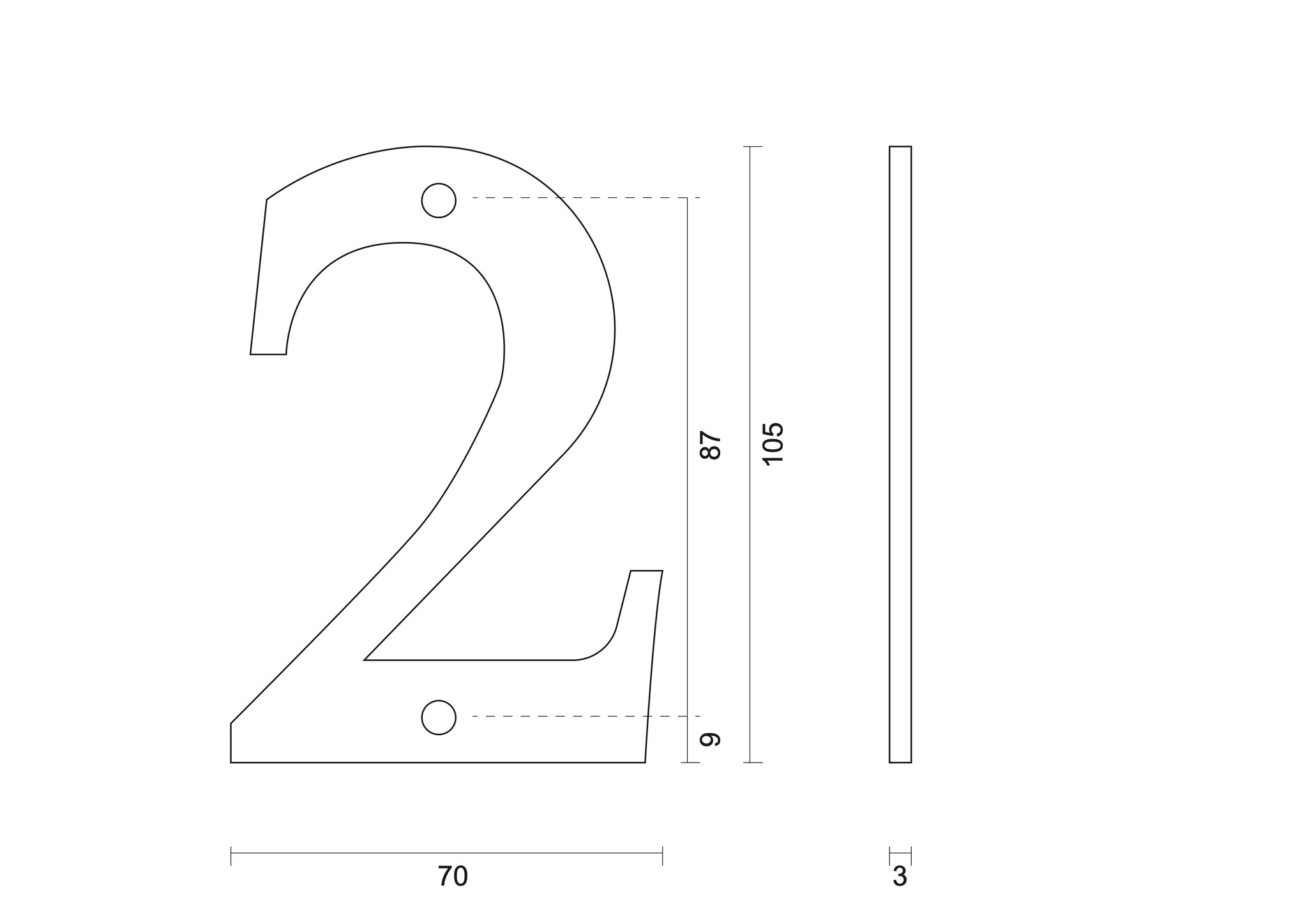 Dit zwarte huisnummer "2" is geschikt voor gevelmontage, heeft en hoogte van 105 mm en een dikte van 3 mm.