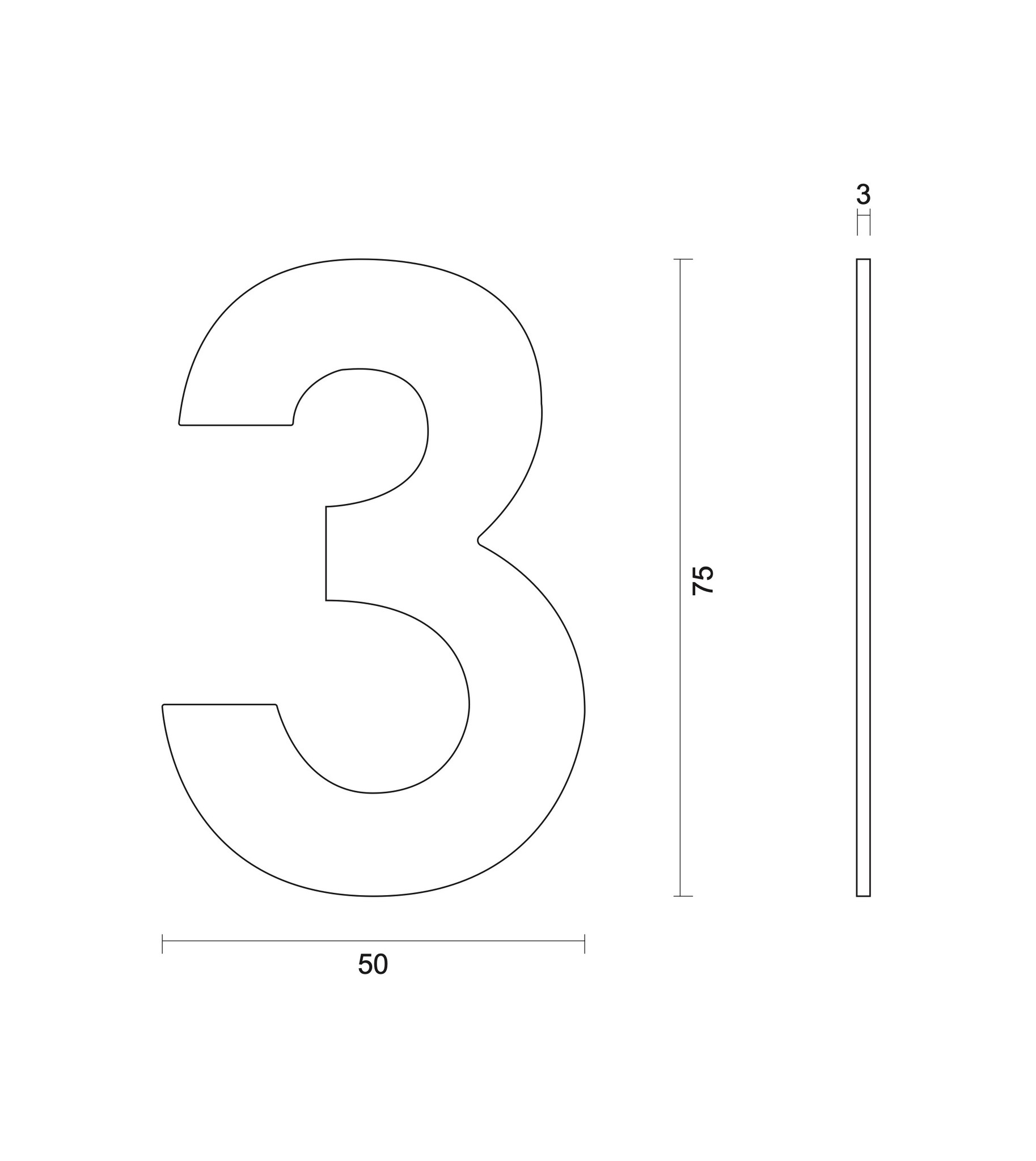 Kleinere uitvoering van een zwart huisnummer "3" met een hoogte van 75 mm. Het zwarte huisnummer is zelfklevend waardoor er geen gaten geboord moeten worden. Het nummer kan op elke vlakke gladde ondergrond geplakt worden.