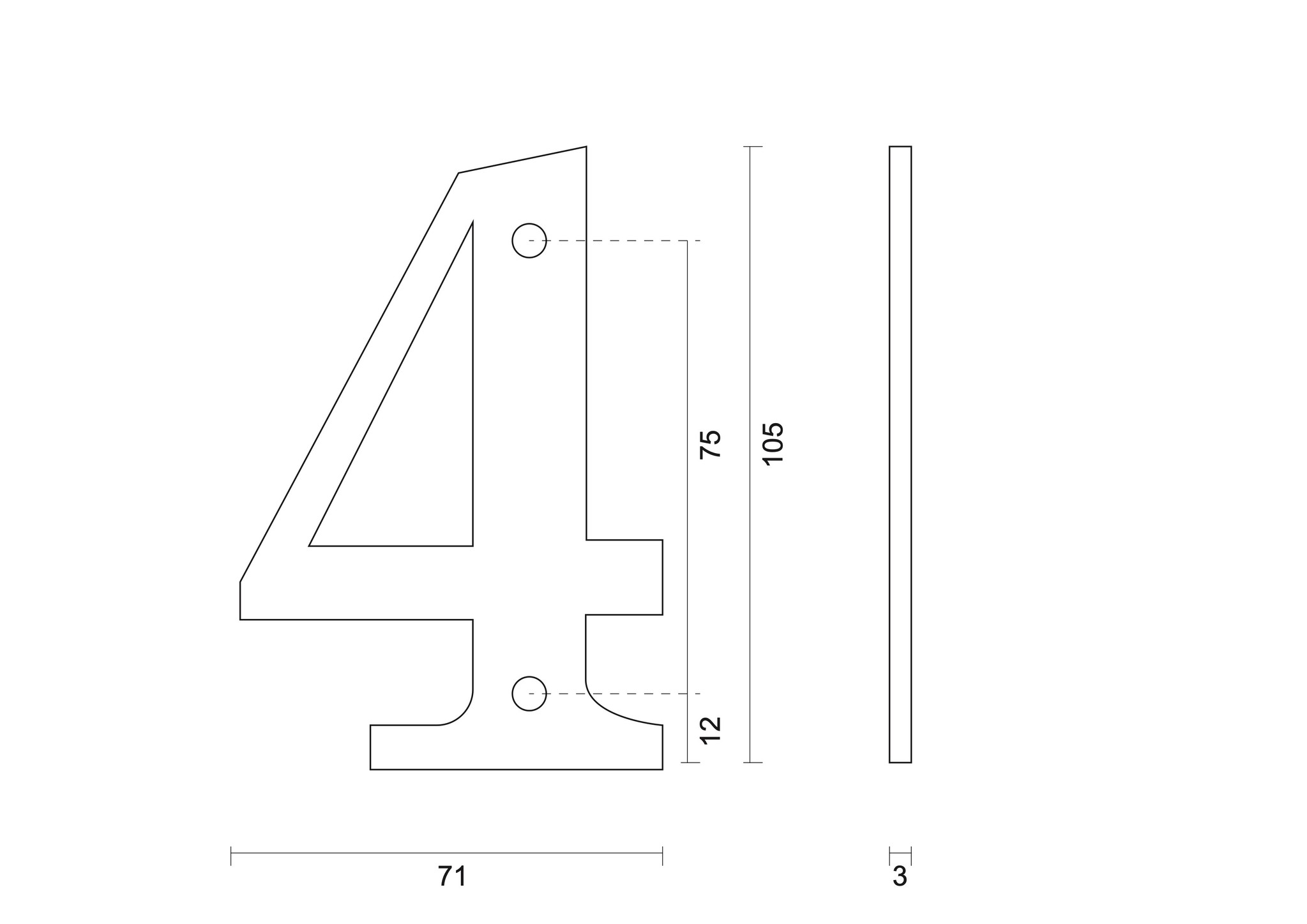 Dit zwarte huisnummer "4" is geschikt voor gevelmontage, heeft en hoogte van 105 mm en een dikte van 3 mm.