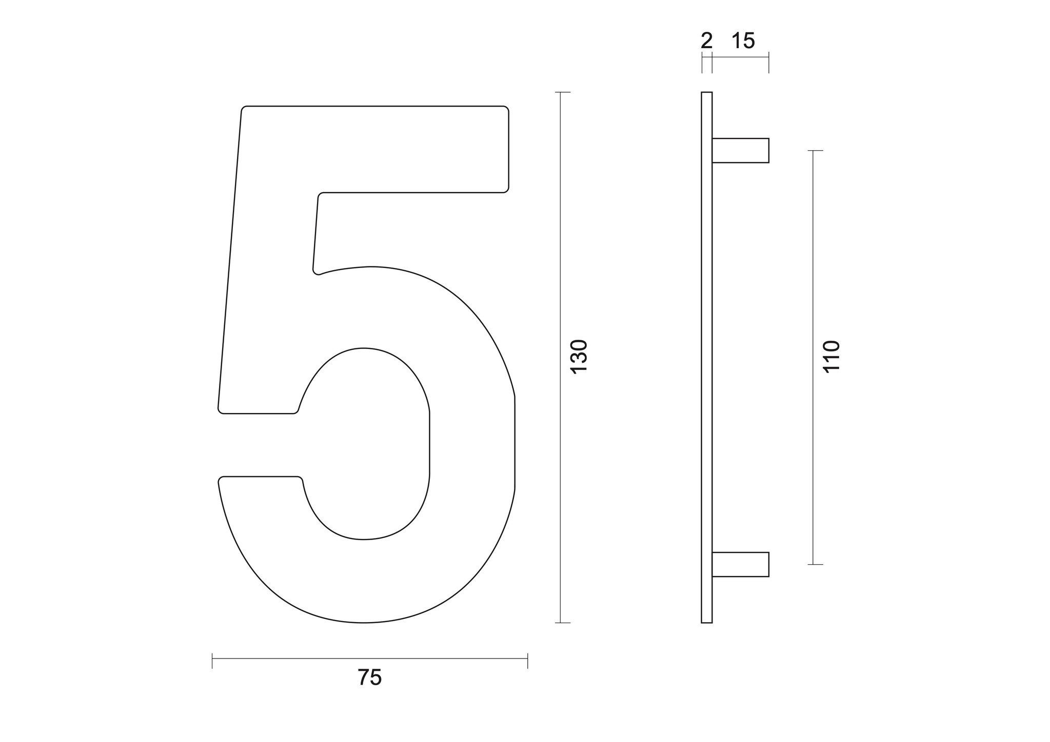 Dit zwarte huisnummer "5" is geschikt voor gevelmontage, heeft en hoogte van 130 mm en een dikte van 2 mm.