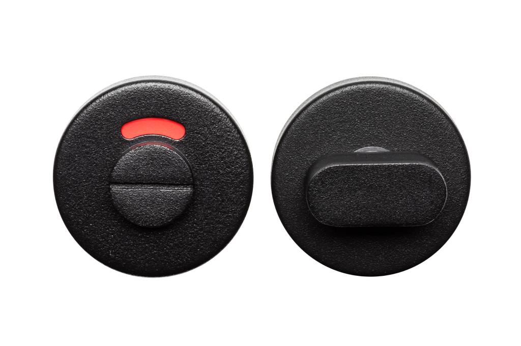 Beschrijving Zwart wc garnituur uit RVS met rood-wit indicator