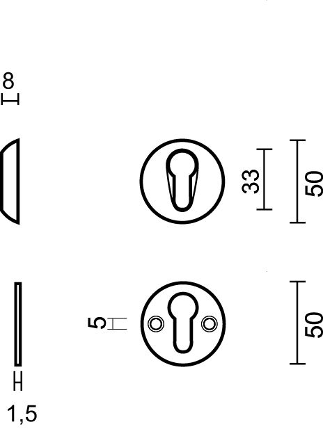 Deze zwarte veiligheidscilinderplaatjes hebben een diameter van 50 mm. Het buitenrozet (A) is 8mm dik en het rozet aan de binnenzijde heeft een dikte van 1,5mm.