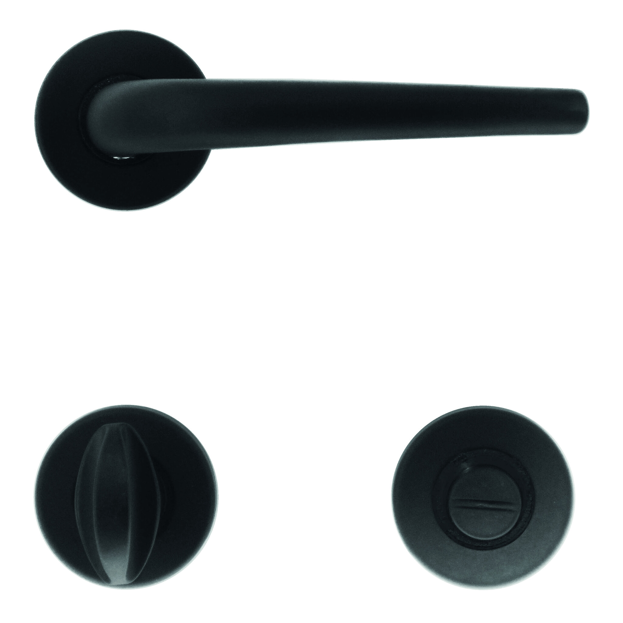 Deze zwarte deurklinken staan op een rond rozet met een diameter van 44mm.