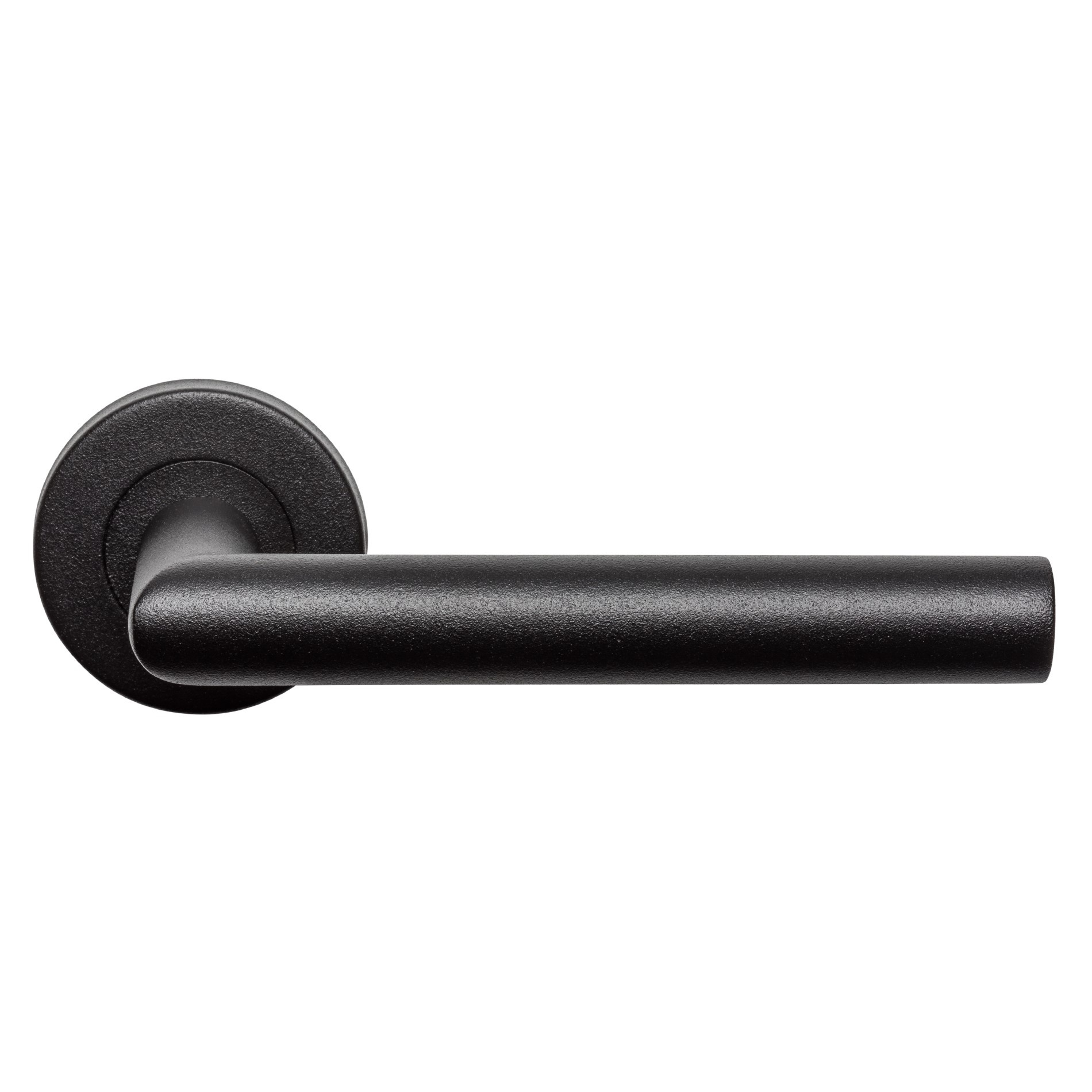 De basis van deze deurklinken is RVS waarna ze een mat zwarte structuurlak hebben bekomen (RAL9005).