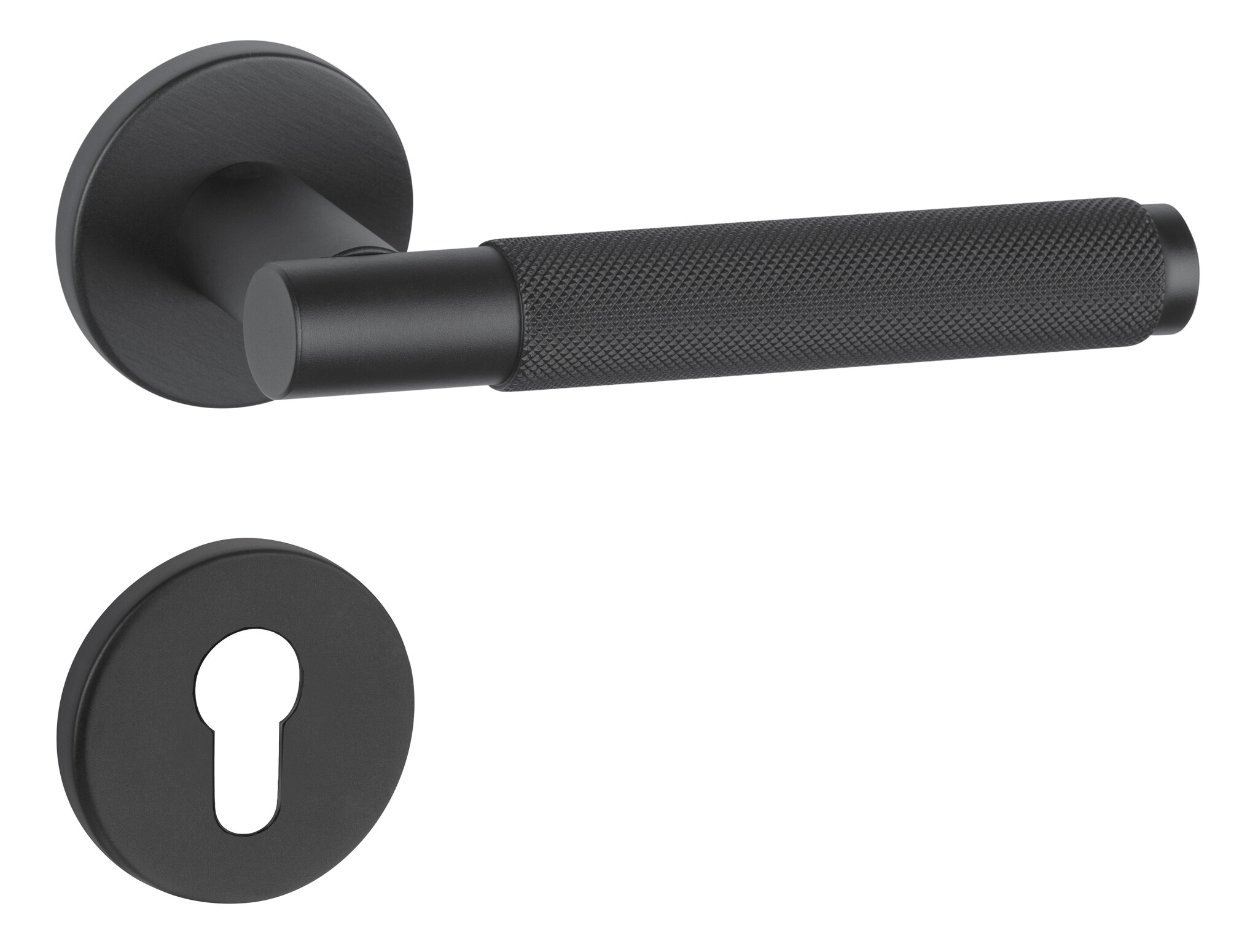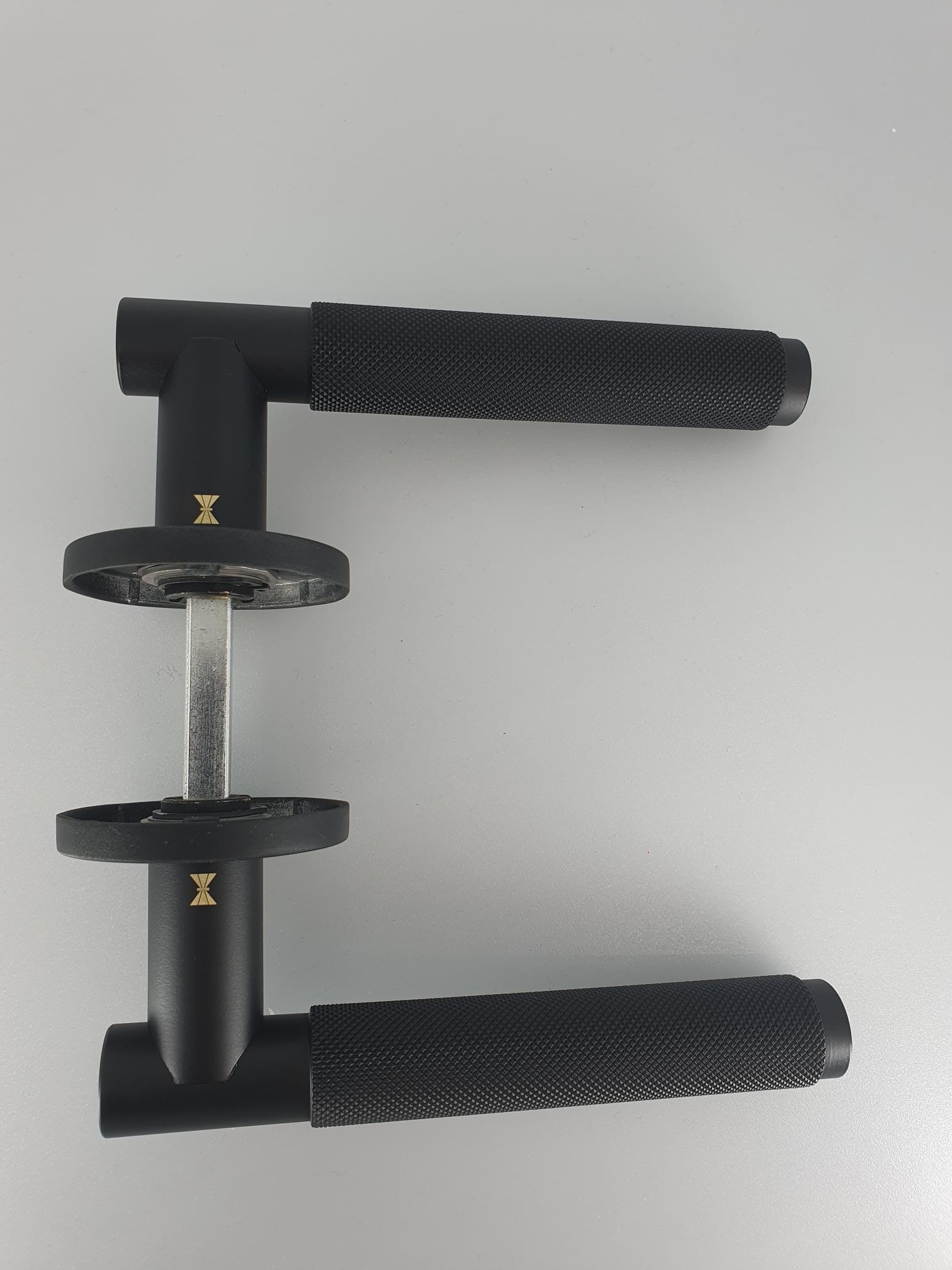 Beschrijving Zwarte massieve deurklinken Marion 1444 met een kruislings geslepen patroon leverbaar in 3 varianten